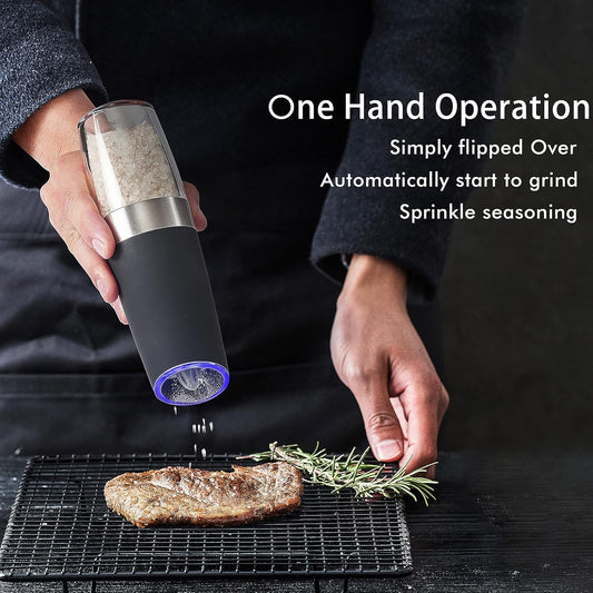 Gravity Electric Salt and Pepper Grinder Mill with Blue LED Light. One Handed Operation, Battery Powered Automatic Pepper Mill with Spoon, Cleaning and Dust Brush, Adjustable Coarseness, Black