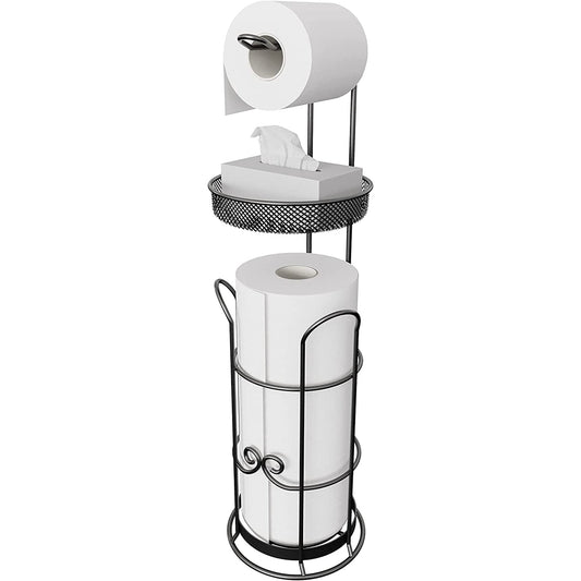 Toilet Paper Holder Stand with Shelf, Freestanding Toilet Tissue Roll Holder with Dispenser for Bathroom Storage Holds 4 Rolls - Black