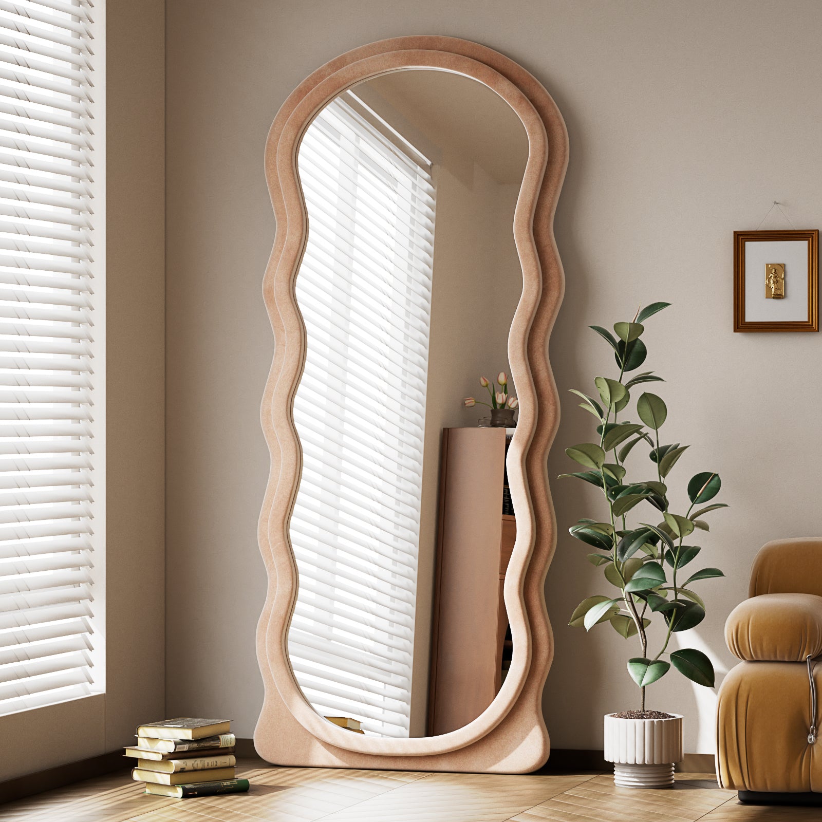Anyrose 71"x30" Irregular Wavy Mirror Full Length Mirror With Flannel Frame, Light Brown