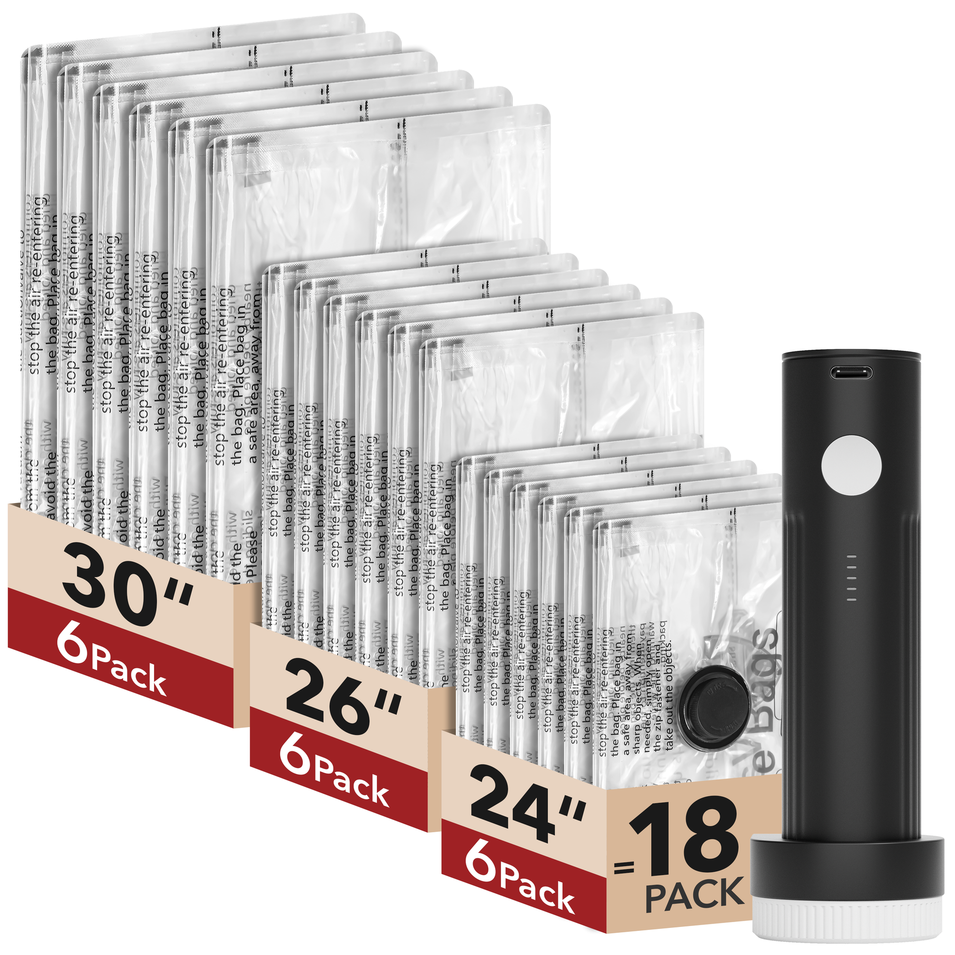 Rechargeable & Wireless Electric Pump: Effortlessly enhance your packing and storage efficiency with our state-of-the-art wireless electric pump. Powered by a 1500mAh battery, it allows you to compress up to 90 bags per charge. With 6000Pa suction, it can compress a bag in 10-15 seconds.
